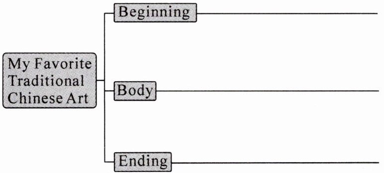 审题指导:1. 说明文 2. 第三人称 3. 一般现在时 4. ①喜欢的工艺品及喜欢的原因 ②它的制作工艺和用途 ③自己的感想或启示;思路点拨:Beginning:Sky lanterns are my favorite traditional Chinese art,for they are colorful and beautiful. Body:①be made of bamboo or metal covered by cloth or paper ②for different celebrations now ③in different shapes ④rise into the air ⑤symbols of happiness and good wishes Ending:the meaning of sky lanterns;小试身手:One possible version:My Favorite Traditional Chinese Art Sky lanterns are my favorite traditional Chinese art, for they are colorful and beautiful. Sky lanterns are made of bamboo or metal covered by cloth or paper with pictures of different characters from Chinese fairy tales. According to Chinese history, sky lanterns were first used by Zhuge Kongming to ask for help when in trouble. But now on the nights of the Lantern Festival and other celebrations, lanterns in different shapes are lit,and they slowly rise into the air like small hot-air balloons. They are regarded as symbols of happiness and good wishes. The sky lanterns remind us that with the development of society,culture keeps changing,but something will remain unchanged. By the way,we must pay attention to the safety when we fly them.