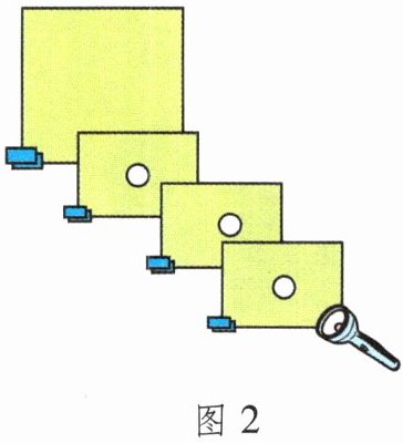 (2)观察图2可知,三张卡纸上的小孔不在一条直线上,光的传播是沿直线进行的,当小孔不在一条直线时,光无法通过这些小孔传播到纸屏上,所以图2的纸屏上不能看到手电筒的光斑。