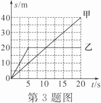 3. (2024·永州祁阳市期末)在操场直跑道上进行遥控小车比赛,甲、乙两车从 $t = 0\ s$ 时由同一起点同方向运动,两者运动的 $s - t$ 图像分别如图中的甲、乙所示,下列判断正确的是(