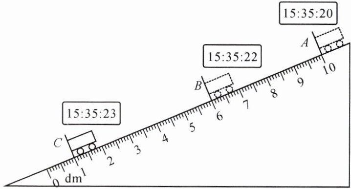 10. (2024·娄底期末)物理实验小组的同学在学习“速度的测量”时,想测量从斜面上滑下的物体在不同阶段的平均速度,设计了如图所示的实验装置:让小车从带有刻度的斜面顶端由静止滑下,图中的方框是小车到达A、B、C三个位置时电子表的显示时间(方框里面的数字分别表示“时:分:秒”),则: