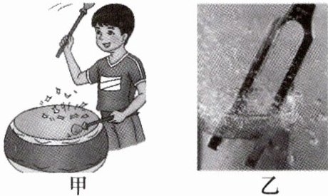 (1) 如图甲,小明在鼓面上撒上纸屑,用鼓槌敲击鼓面,鼓面发声,同时鼓面上的纸屑跟着跳动起来;如图乙,再用鼓槌敲击音叉,音叉发声,将发声的音叉放入水中,音叉周围溅起了很多水花。这说明发声的物体都在