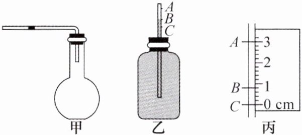 (填“A”或“C”)。再用该温度计测室内温度,液柱正好移动到B处,接着将刻度尺的零刻度线对准C,则A、B在刻度尺中的位置如图丙所示,那么此时室温为18