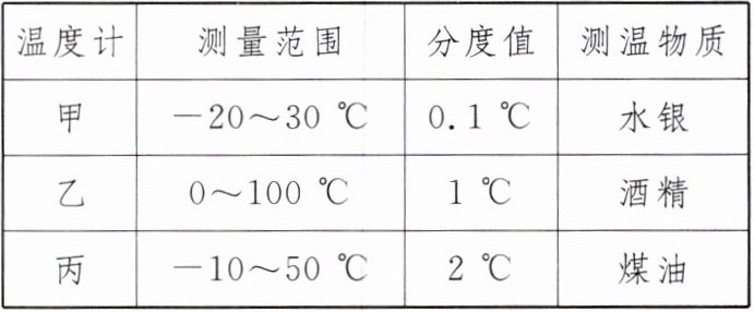 9. 北京五中校本经典题 研究电冰箱内的温度分布情况,需要将几支温度计分别放在冰箱内多个位置,几分钟后,记录各测量点的温度。为了顺利完成这项研究,表中提供的三种规格的温度计应选用