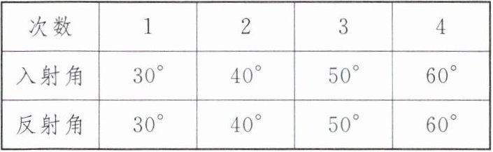 (填“靠近”或“远离”)平面镜。进行实验后的测量数据如下表,由此可得:在反射现象中,反射角等于入射角
