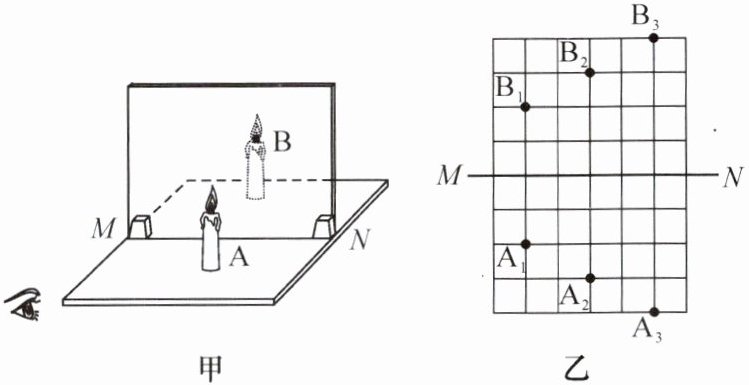 放置在水平桌面上。(2)将点燃的蜡烛A放置在MN前面,将外形相同、没有点燃的蜡烛B在MN后面移动,直至与A的像完全重合,重合现象说明