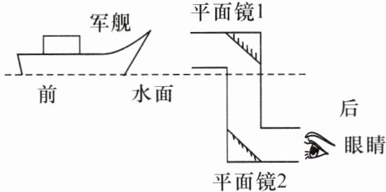 原理。现有一艘军舰位于与平面镜$1$等高的正前方,则人眼看到军舰所成的虚像位于与平面镜2等高的正前方