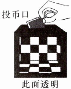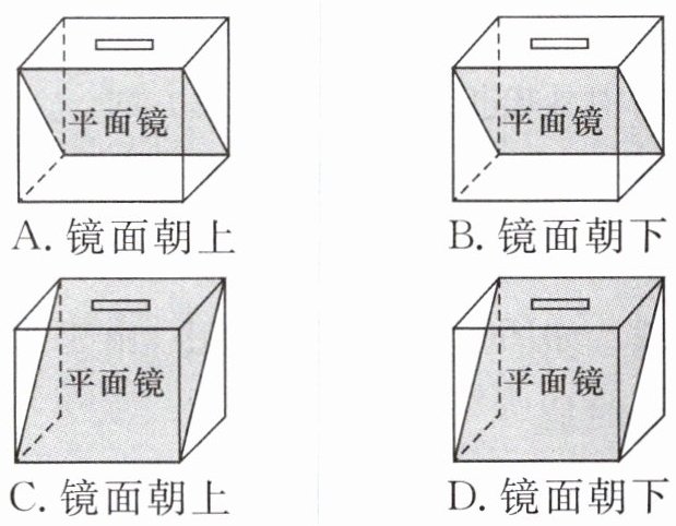 9. 小明在科技节中表演魔术:从投币口投入只有正面透明的棋盘格空箱的硬币消失了!随后他揭秘:这是平面镜和棋盘格共同形成的结果。下列放置平面镜的方式能实现这个魔术效果的是(