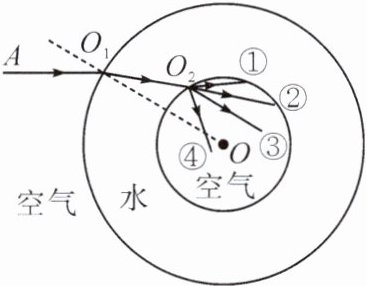 15. 在天宫课堂中,航天员王亚平将空气注入水球,形成的气泡球与水球的球心都在O点。一束光从空气射入水球的光路如图所示,其中球心O与入射点O₁的连线为法线。则进入气泡球的折射光线可能为(