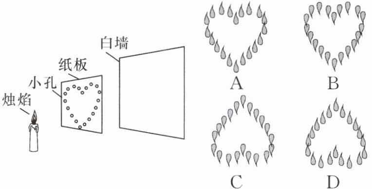 5. (2025·长沙模拟)如图所示,在一个纸板上打若干个小孔,组成一个心形。在室内让这个纸板在烛焰和白墙之间移动,在墙上能看到的图案是(