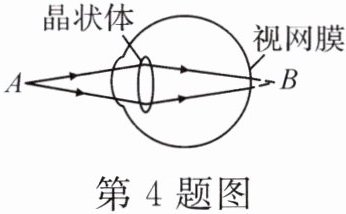 4. 如图所示,来自物体上A点的光经过眼睛的晶状体成像在视网膜后面的B点,要使成在B点的像靠近视网膜,物体应该向
