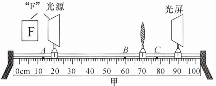 9. 为了探究远视眼的矫正过程,组装如图甲所示的实验装置,其中“F”字样的光源模拟可视物体,光屏模拟视网膜。选用如图乙所示的2号凸透镜模拟晶状体,打开“F”光源,调节各个元件的位置,直到光屏上呈现倒立、缩小的清晰像,正常眼睛的视物模型便组装完成。