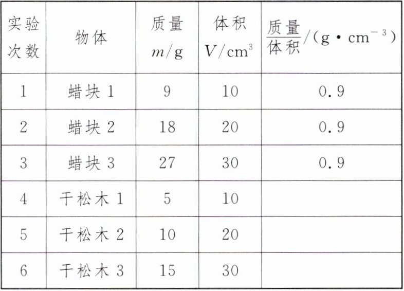 1. 为了探究“物质的质量跟体积的关系”,同学们找来大小不同的蜡块和干松木做实验,得到的数据如表所示。