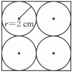 3. 如右图,正方形中有四个大小相等的圆,已知圆的半径是 $ 2 \mathrm { cm } $。这个正方形的面积是多少平方厘米?