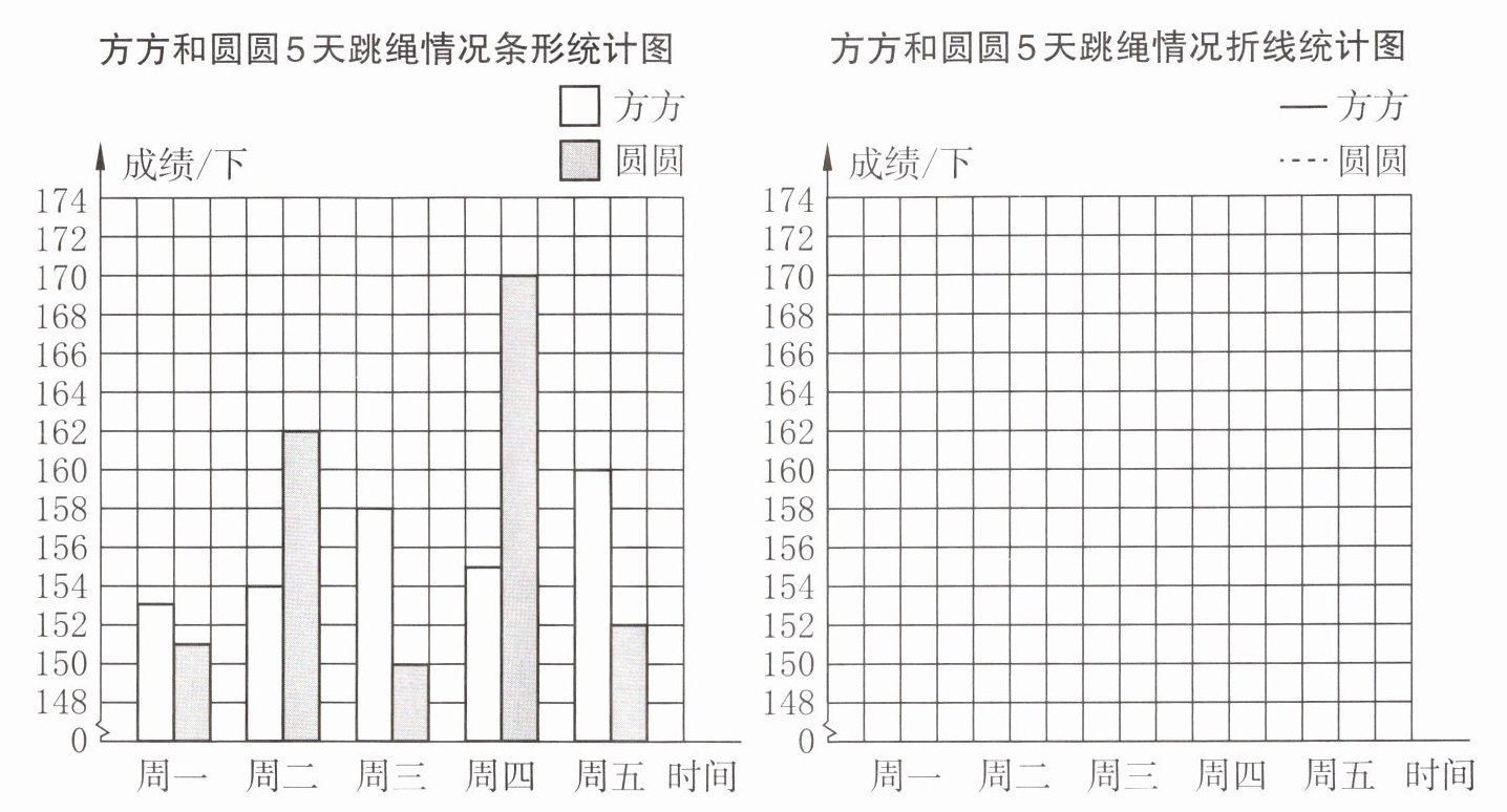 1. 方方和圆圆5天跳绳情况如下图。请完成下面的折线统计图。