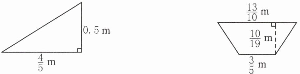 第二个图形面积:$\left( \frac{13}{10} + \frac{3}{5} \right) × \frac{10}{19} ÷ 2 = \frac{1}{2}\, \text{m}^2$