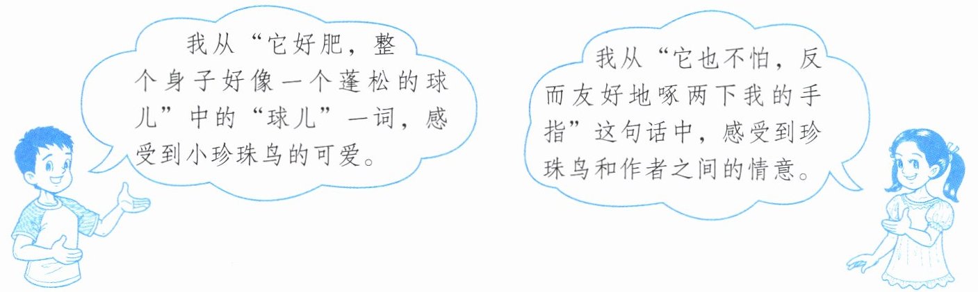 感受:从“球儿”一词感受到小珍珠鸟的可爱;从“友好地啄两下我的手指”感受到珍珠鸟和作者之间的情意。