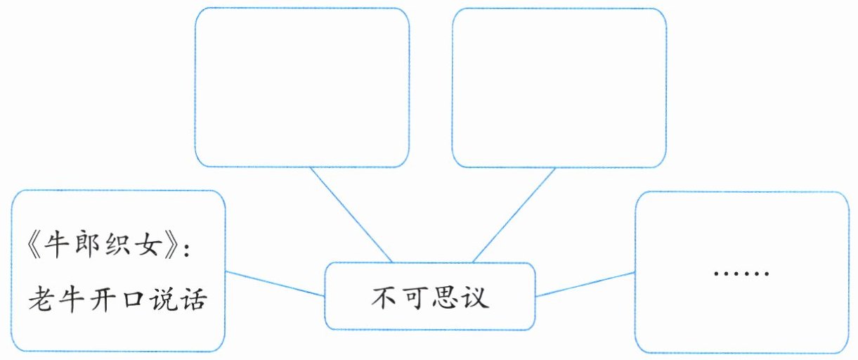 【解析】:本题主要考查对民间故事中不可思议情节的提取与拓展能力。需要从所学或所知的民间故事里找出类似“老牛开口说话”这样违背常理、充满奇幻色彩的情节。在解答时,要先明确民间故事的范围,然后回忆其中具有不可思议情节的内容,按照示例的格式进行填写。
