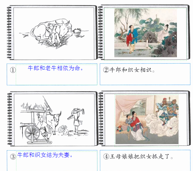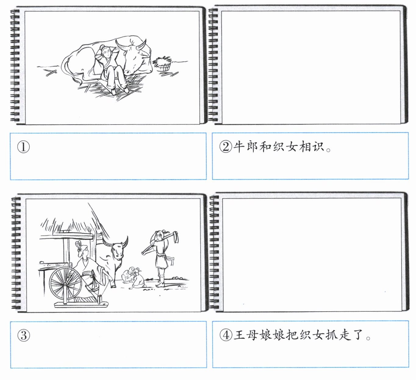 3. 结合课文和《牛郎织女(一)》的内容,把下面的连环画补充完整,并试着用"人物+事件"的方法配上简短的文字。