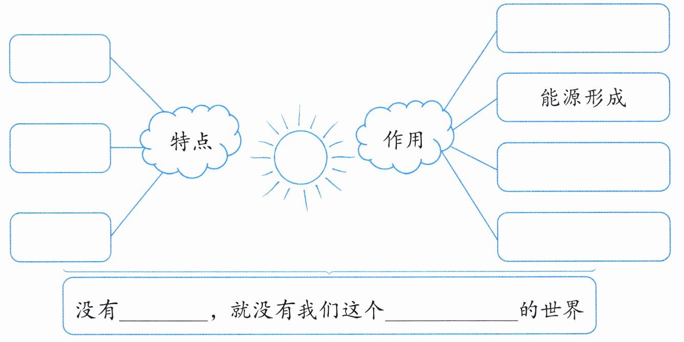 【解析】:本题考查对课文《太阳》内容的理解与概括,需要从课文中提取关于太阳的特点和作用的相关信息,准确填写在思维导图中。课文从距离、大小、热度等方面介绍了太阳的特点,以及太阳在能源形成、动植物生长、人类生活等方面的重要作用。