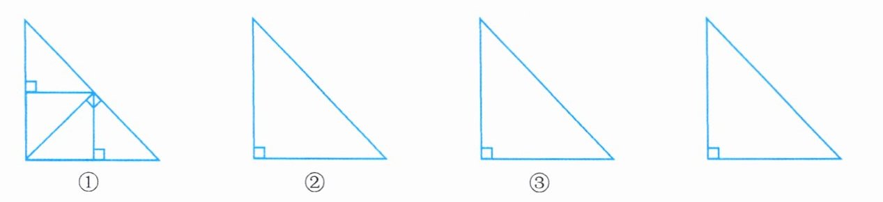 *7. 任意一个等腰直角三角形都可以分割成四个小三角形,使每个小三角形都与原等腰直角三角形相似(如图①是其中的一种分法)。你还有几种不同的分割方案?请在备用三角形(图②③④)中画出分割图形。