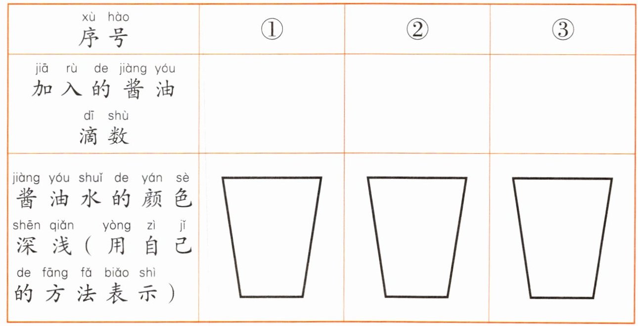 | 序号 | 加入的酱油滴数 | 酱油水的颜色深浅(用自己的方法表示) |