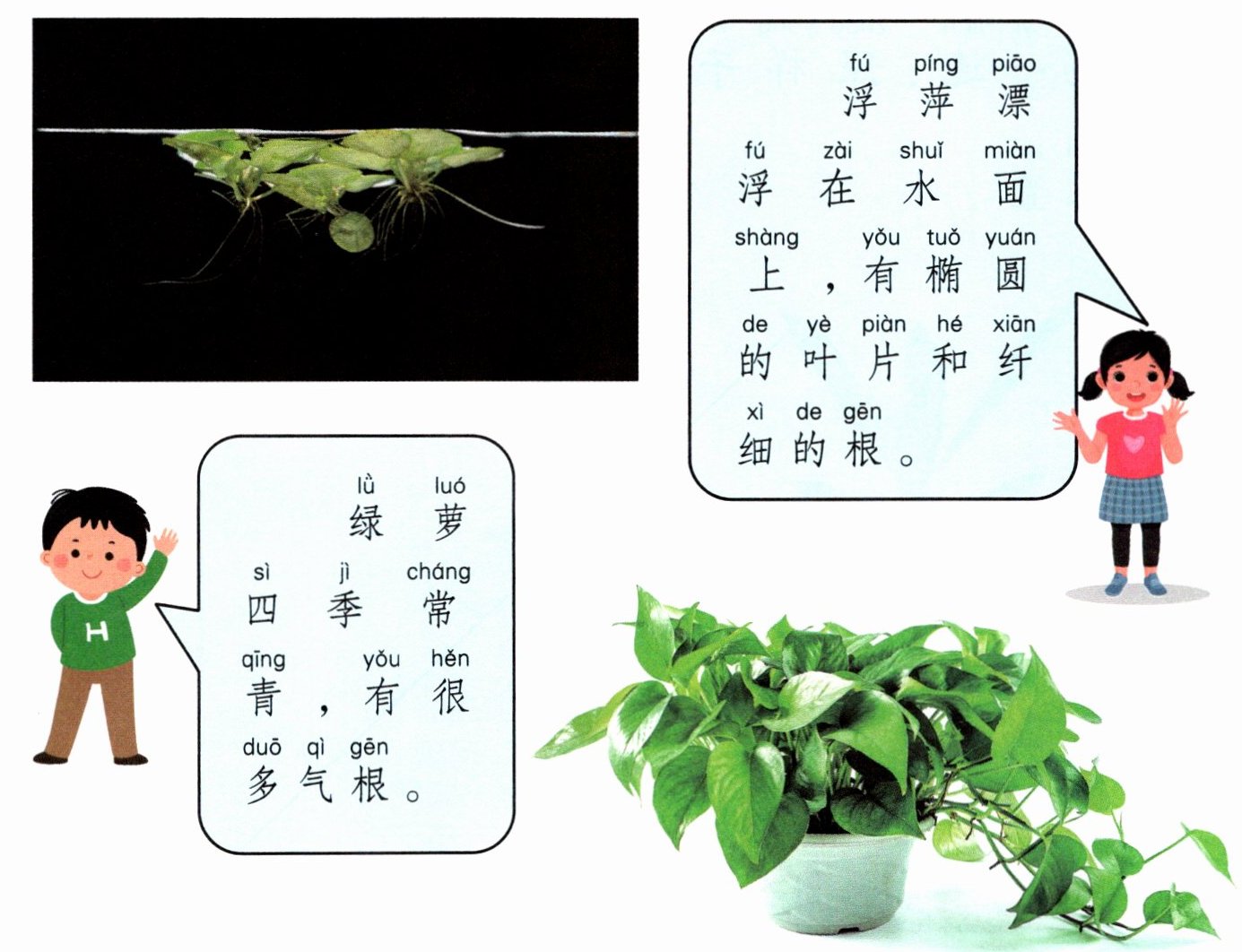 【解析】:本题考查一年级科学中植物的特点相关知识。题目要求根据给出的几种植物(樟树、浮萍、绿萝)已描述的特点,说出它们其他的特点。对于一年级学生,可从植物的生长环境、繁殖方式、叶片形状等方面思考。