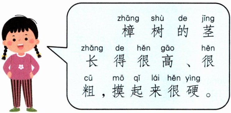 樟树:除了茎长得很高、很粗,摸起来很硬外,它的叶子是椭圆形的,四季常绿,还会开花结果,果实像小珠子。