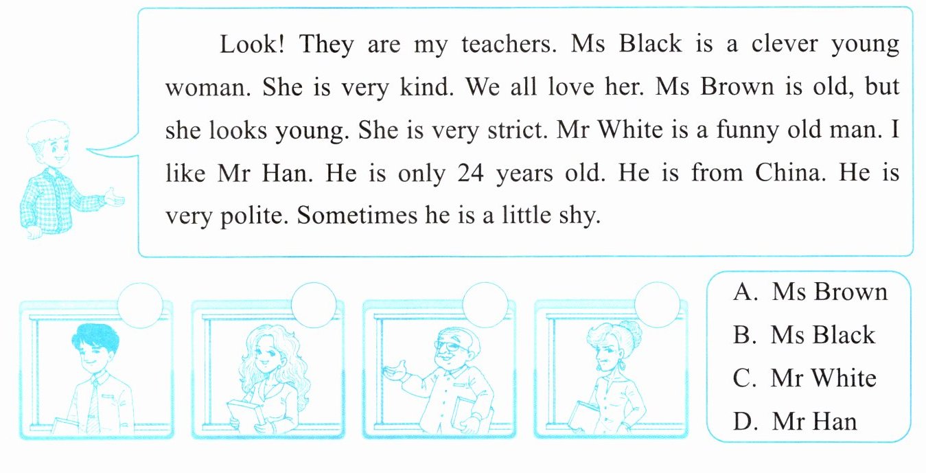 1) Ms Black 2) Ms Fox 3) Mr Green 4) Mr Han