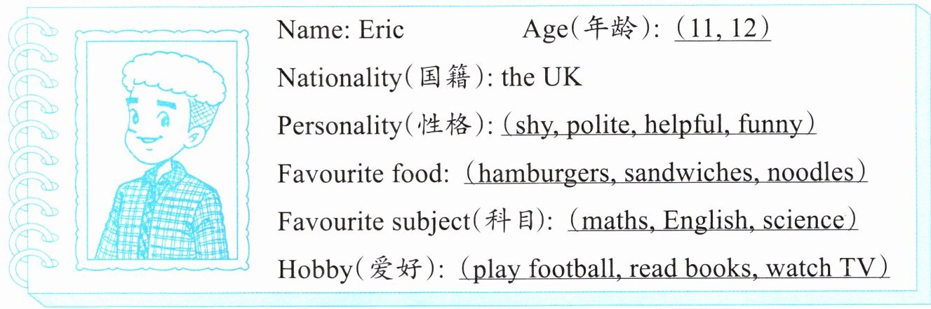 这是一道英语听力题目,要求根据听到的内容圈出相应的选项。题目给出了一个名为Eric的男孩的信息,包括年龄、国籍、性格、最喜欢的食物、最喜欢的科目和爱好。学生需要在听录音时,根据录音内容圈出与Eric信息相符的选项。由于本题未给出听力材料,故无法给出具体的圈选答案,但可以按照以下思路进行: