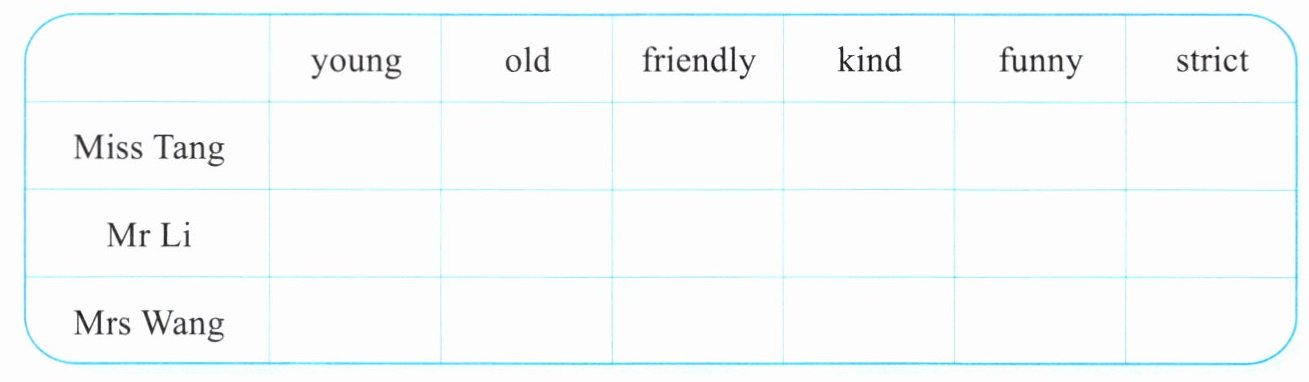注:答案中的形容词(old, strict, funny, tall, thin)是基于常见的描述人物特征的词汇,并且符合对话的语境。由于题目没有给出具体的选项或限制,这些答案只是示例,并不是唯一正确的答案。其他合理的形容词同样可以使用。