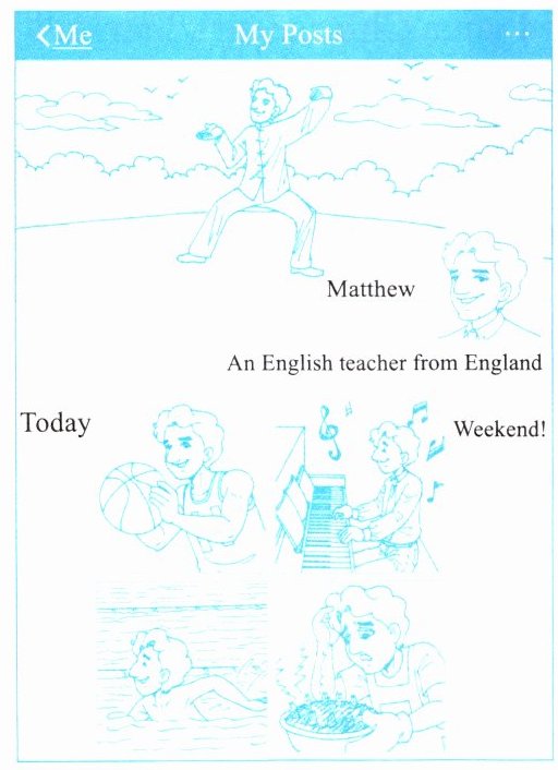 4. 图片中呈现了Matthew在周末会游泳和做饭,“游泳”是“swim”,“做饭”是“cook”,故第四个空填“swim”,第五个空填“cook”。