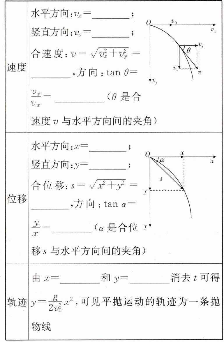 (1)$v_{0}$ $gt$ $\sqrt {v_{0}^{2}+(gt)^{2}}$ $\frac {gt}{v_{0}}$ $v_{0}t$ $\frac {1}{2}gt^{2}$ $\sqrt {(v_{0}t)^{2}+(\frac {1}{2}gt^{2})^{2}}$ $\frac {gt}{2v_{0}}$ $v_{0}t$ $\frac {1}{2}gt^{2}$