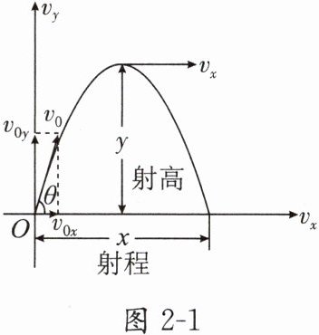 斜抛运动的分析方法与平抛运动的分析方法相同,即将运动分解为水平方向与竖直方向的两个分运动进行研究,如图 2 - 1.