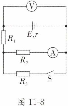10. 在图 11-8 所示的电路中, $ R_{1}= 9 \Omega, R_{2}= 30 \Omega, \mathrm{S} $ 闭合时, 理想电压表 $ \mathrm{V} $ 的示数为 $ 11.4 \mathrm{~V} $, 理想电流表 $ \mathrm{A} $ 的示数为 $ 0.2 \mathrm{~A} $; $ \mathrm{S} $ 断开时, 理想电流表 $ \mathrm{A} $ 的示数为 $ 0.3 \mathrm{~A} $. 求: