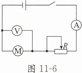 7. (多选) 在研究微型电动机的性能时, 可采用图 11-6 所示的实验电路, 电路中电表均为理想电表. 当调节滑动变阻器 $ R $, 使电动机停止转动时, 电流表和电压表的示数分别为 $ 0.5 \mathrm{~A} $ 和 $ 1.0 \mathrm{~V} $; 重新调节 $ R $, 使电动机恢复正常运转时, 电流表和电压表的示数分别为 $ 2.0 \mathrm{~A} $ 和 $ 15.0 \mathrm{~V} $. 则当这台电动机正常运转时 (