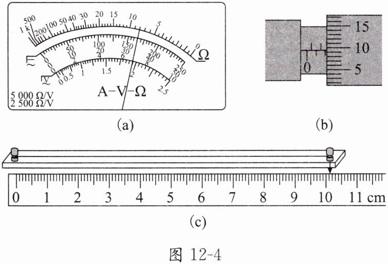 (1)由题图(a)所示多用电表可知,待测电阻阻值是 8×1Ω = 8Ω;由题图(b)所示螺旋测微器可知,固定刻度读数为 2mm,可动刻度读数为 0.01×9.5mm = 0.095mm,其读数为 2mm + 9.5×0.01mm = 2.095mm;题图 12 - 4(c)所示毫米刻度尺示数为 10.14cm。