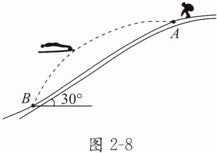 8. 跳台滑雪是一项勇敢者的运动. 如图 2 - 8 所示,某运动员从跳台 $ A $ 处沿水平方向飞出,在斜面 $ AB $ 上的 $ B $ 处着陆,斜面 $ AB $ 与水平方向间的夹角为 $ 30^{\circ} $ 且足够长,不计空气阻力,下列说法正确的是(