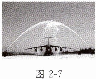7. 图 2 - 7 所示为“飞机过水门”仪式,其寓意为“接风洗尘”. 在某次“飞机过水门”仪式中,两条水柱分别从停在飞机左、右两侧的两辆大型消防车上相对斜向上射出,假设两水柱射出时与水平方向的夹角分别为 $ 45^{\circ} $ 与 $ 30^{\circ} $,两水柱恰好在最高点相遇,不计空气阻力和水柱间的相互影响,则两水柱射出时的速度大小之比为(