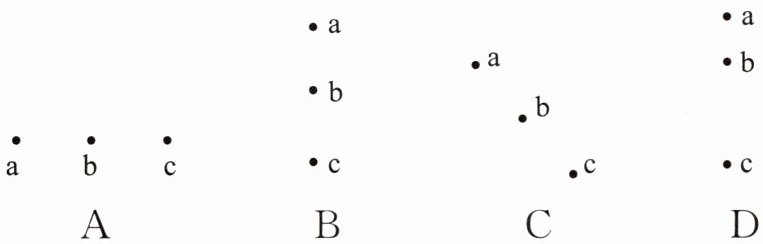6. 在空中同一位置同时将三个小球 $ a $、$ b $、$ c $ 沿同一方向水平抛出,其速度大小分别为 $ v $、$ 2v $ 和 $ 3v $,某一时刻三个小球在空中的位置排布应是下列选项图中的(