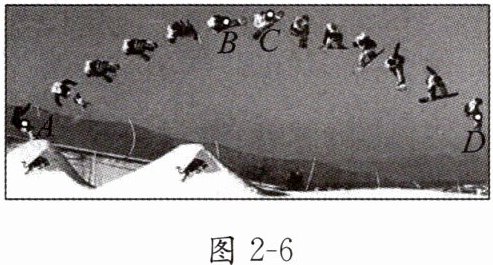 5. 某一滑雪运动员从滑道滑出并在空中翻转时经多次曝光得到的照片如图 2 - 6 所示,每次曝光的时间间隔相等. 若运动员的重心轨迹与同速度不计阻力的斜抛小球轨迹重合, $ A $、$ B $、$ C $ 和 $ D $ 表示重心位置,且 $ A $ 和 $ D $ 处于同一水平高度. 下列说法正确的是(