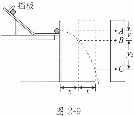 9. 在做“探究平抛物体的运动特点”的实验中,为了确定小球在不同时刻所通过的位置,实验时用图 2 - 9 所示的装置,先将斜槽轨道的末端调整水平,在一块平木板表面钉上复写纸和白纸,并将该木板竖直立于槽口附近处,使小球从斜槽上紧靠挡板处由静止释放,小球撞到木板并在白纸上留下痕迹 $ A $;将木板向远离槽口方向平移距离 $ x $,再使小球从斜槽上紧靠挡板处由静止释放,小球撞在木板上得到痕迹 $ B $;又将木板再向远离槽口方向平移距离 $ x $,小球再从斜槽上紧靠挡板处由静止释放,再次得到痕迹 $ C $. 若测得木板每次移动的距离 $ x = 10.00 \, \text{cm} $, $ A $、$ B $ 间的距离 $ y_1 = 4.78 \, \text{cm} $, $ B $、$ C $ 间的距离 $ y_2 = 14.58 \, \text{cm} $. ( $ g $ 取 $ 9.80 \, \text{m/s}^2 $ )