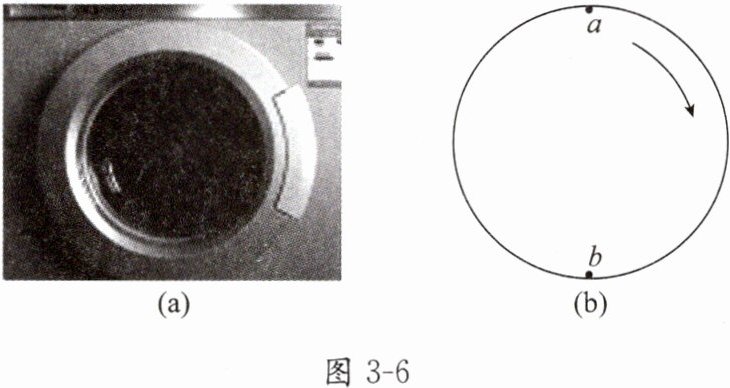 6. 如图3-6(a),滚筒洗衣机脱水时,衣物紧贴着滚筒壁在竖直平面内沿顺时针方向做匀速圆周运动.如图3-6(b),一件小衣物(可理想化为质点)的质量为$m$,滚筒半径为$R$,角速度大小为$ω$,重力加速度为$g$,$a$、$b$分别为小衣物经过的最高位置和最低位置.下列说法正确的是(