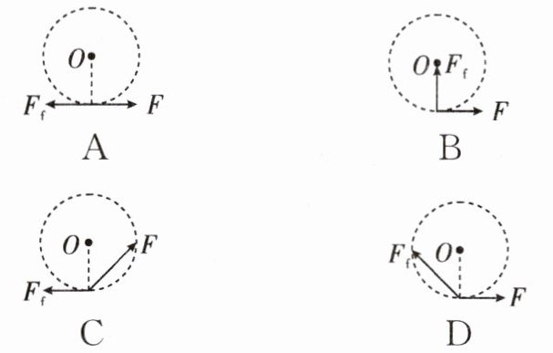 4. 一只小狗拉着雪橇在水平冰面上沿着圆形的道路匀速奔跑,下列关于雪橇所受的牵引力$F及摩擦力F_{f}$的示意图正确的是(