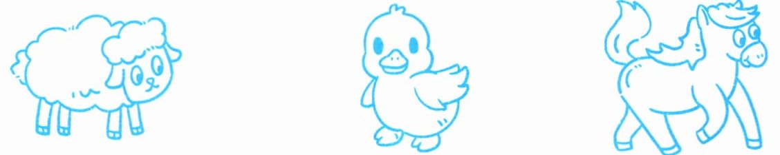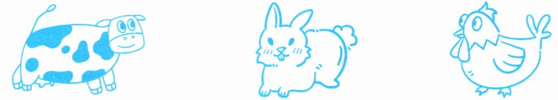 1.a grey rabbit 2.a yellow chicken 3.a white sheep 4.a yellow duck 5.a brown horse