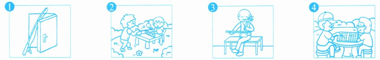 1. fishing rod 2. ping-pong 3. erhu 4. chess