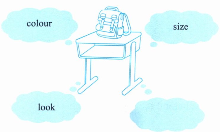 A. Colour the schoolbag. Then write down a few phrases to describe it according to the given aspects. 给书包上色,然后根据所提供的角度,用几个短语描述这个书包。