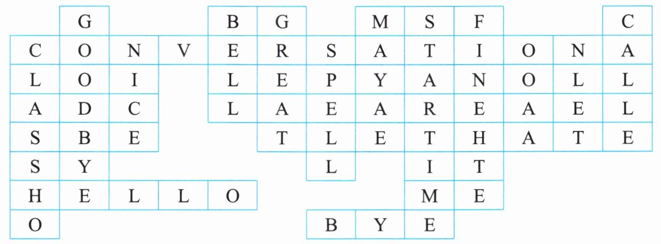 Across: conversation, hello, bye, let, hate, hat, me, are, it, on, no, at, that