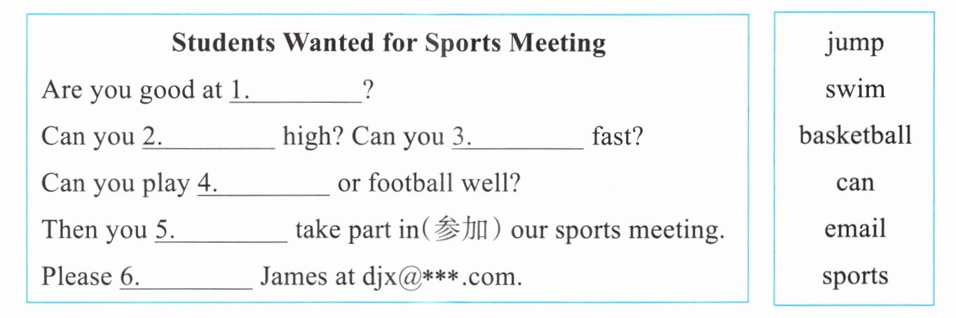 1. sports 2. jump 3. swim 4. basketball 5. can 6. email 7. One possible version: I want to choose swimming because I am good at swimming.