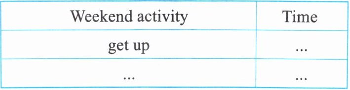 One possible version: I get up at around 7 o'clock at weekends. I have breakfast at about 8 o'clock. At half past eight, I begin to do my homework. At noon, my parents take me to eat outside. In the afternoon, I often play sports with my friends. We are really happy to be together. In the evening, I often watch CCTV news with my parents. I go to bed at about 9:00.