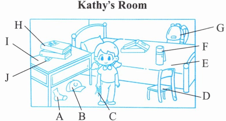 Ⅱ. 2. bottle, F 3. books, H 4. eraser, J 5. desk, I 6. chair, D